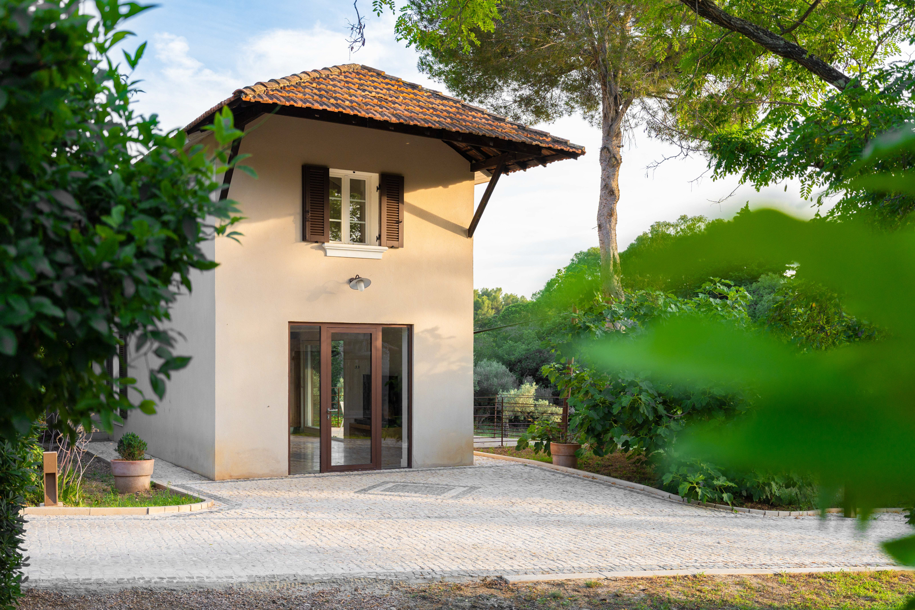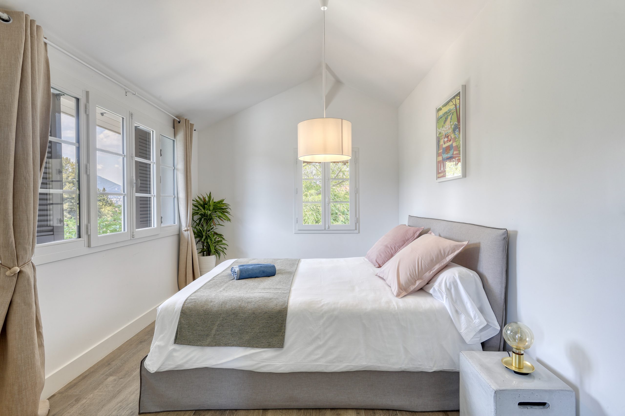 . une chambre de 30 m² avec salle de bains et WC indépendants, placard de rangement, lit de 160 cm, vue oliviers.