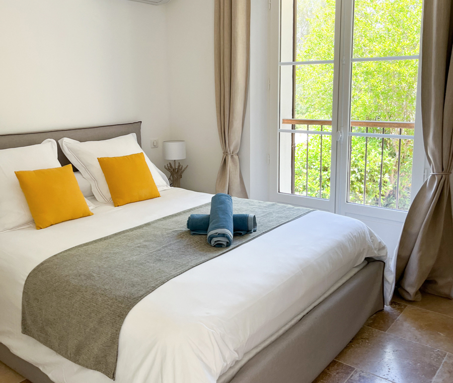 . une chambre de 20 m² avec salle de bains et WC indépendants, placard de rangement, lit de 160 cm, vue « Mont Coudon » et petit bois.