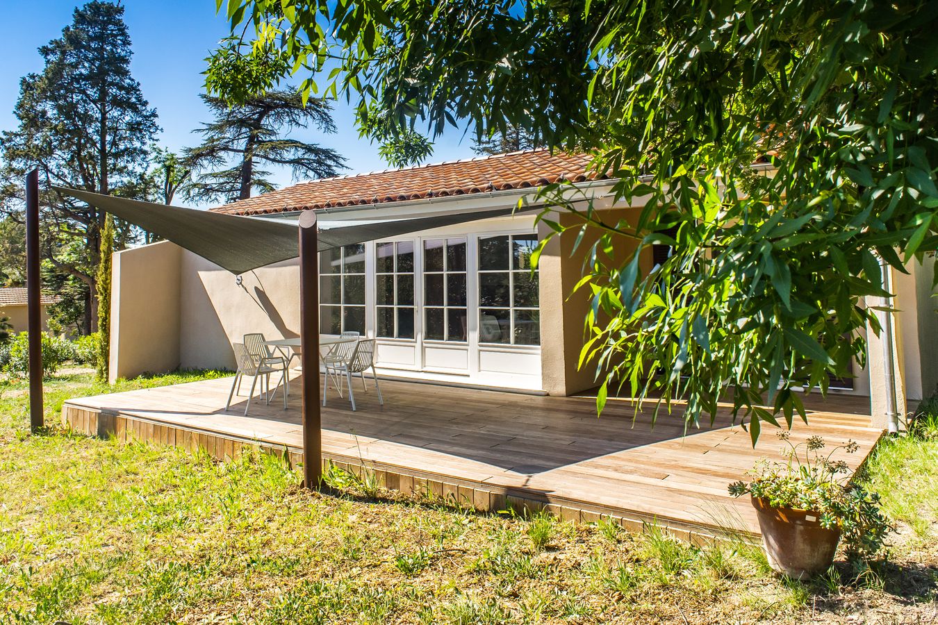 La maison dispose d’une grande terrasse équipée d’un voile d’ombrage, table et chaises.