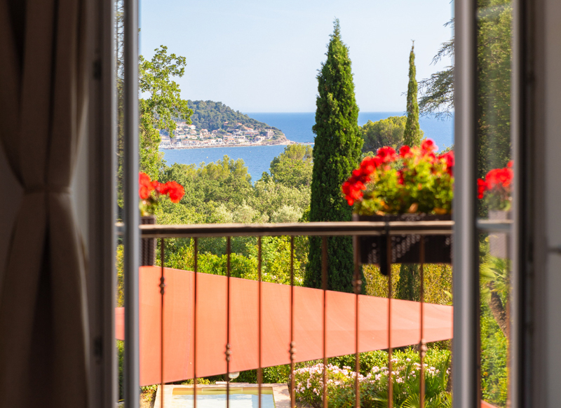 . une chambre avec salle de bains indépendante, WC indépendant, placard de rangement d’une surface totale de 25 m² avec un lit de 160 cm, téléviseur écran plat, vue mer et porte-fenêtre donnant sur balcon équipé d’une table et deux chaises
